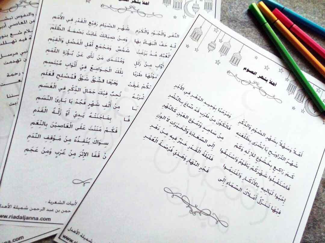 مجموعة منتقاة من الأشعار عن شهر رمضان المبارك .. ليحفظها الأطفال فتنمي لغتهم و تزيد حصيلتهم اللغوية .. جاهزة للتحميل و الطباعة