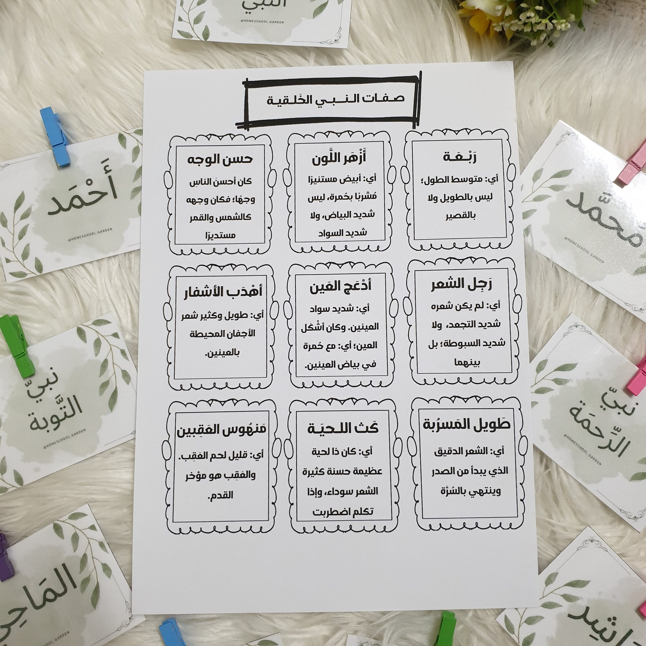 أوراق عمل مجانية و بطاقات تشتمل على أسماء النبي عليه الصلاة و السلام و بعضاً من صفاته الخَلقية (الشكلية) تعرض بطريقة تفاعلية تشجع البحث والتعلم