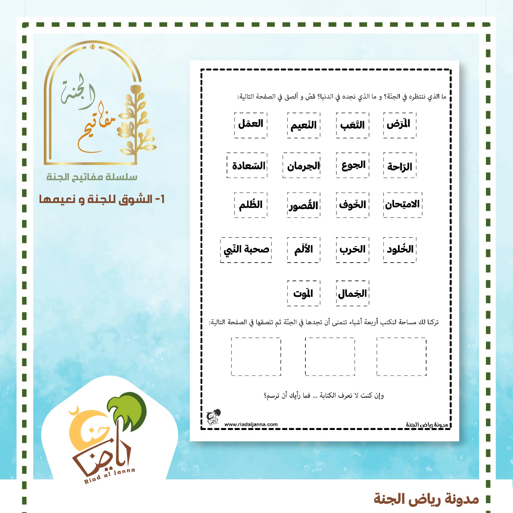 أوراق العمل مقسمة إلى مستويين … المستوى الأول يقوم فيه الطفل بتصنيف الكلمات الموجودة في الورقة بين أشياء تكون في الدنيا فقط مثل الخوف و المرض و الجوع .. و بين أشياء توجد في الجنة مثل النعيم و الخلود …