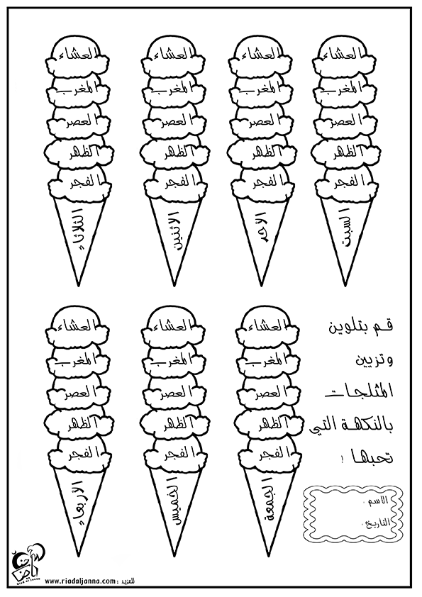 بقوم الأطفال بتلوين كل جزء من الورقة بعد أداء صلاة الفريضة كما التالي :