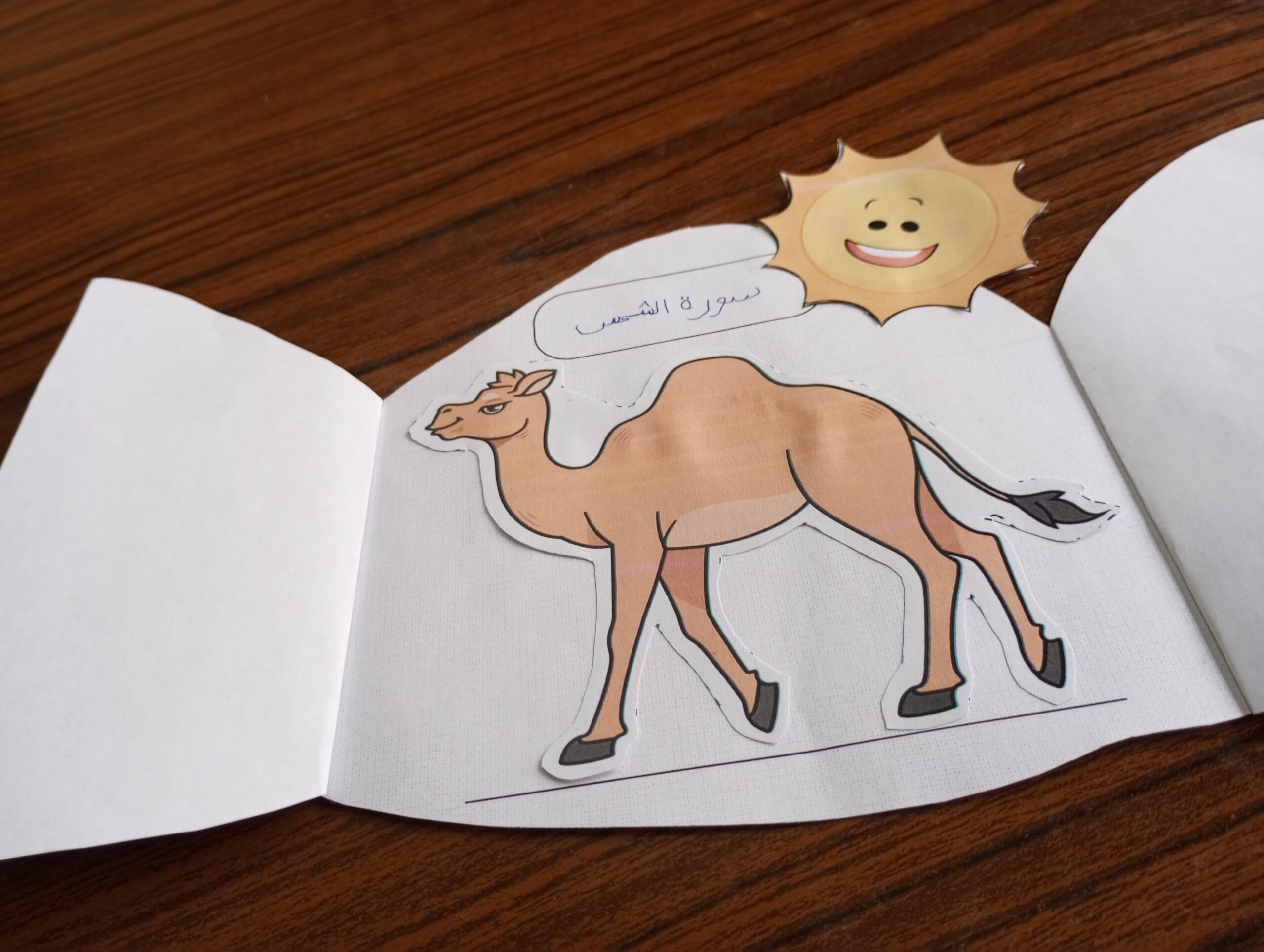 يقوم الطفل بقص الأشكال الموجودة في الورقة و يلصقها في مكانها الصحيح ليحصل على بطاقة تغلق و تفتح و يكتب اسم السورة الصحيح في الأعلى
