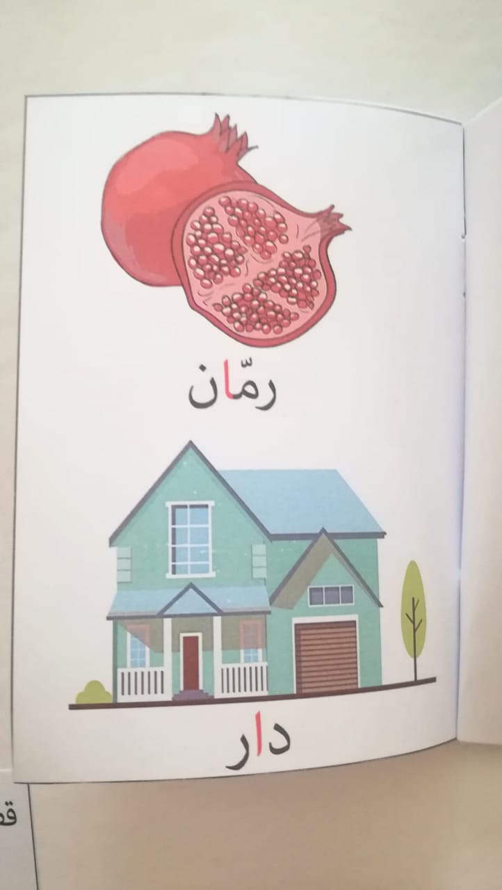 - صور ملونة لبعض الكلمات التي يتواجد فيها الحرف مع التركيز على شكل الحرف و مكانه و نلاحظ أنه في هذا المستوى الأول من الكتيبات سيتم عرض شكلين لكل حرف على الطفل فقط