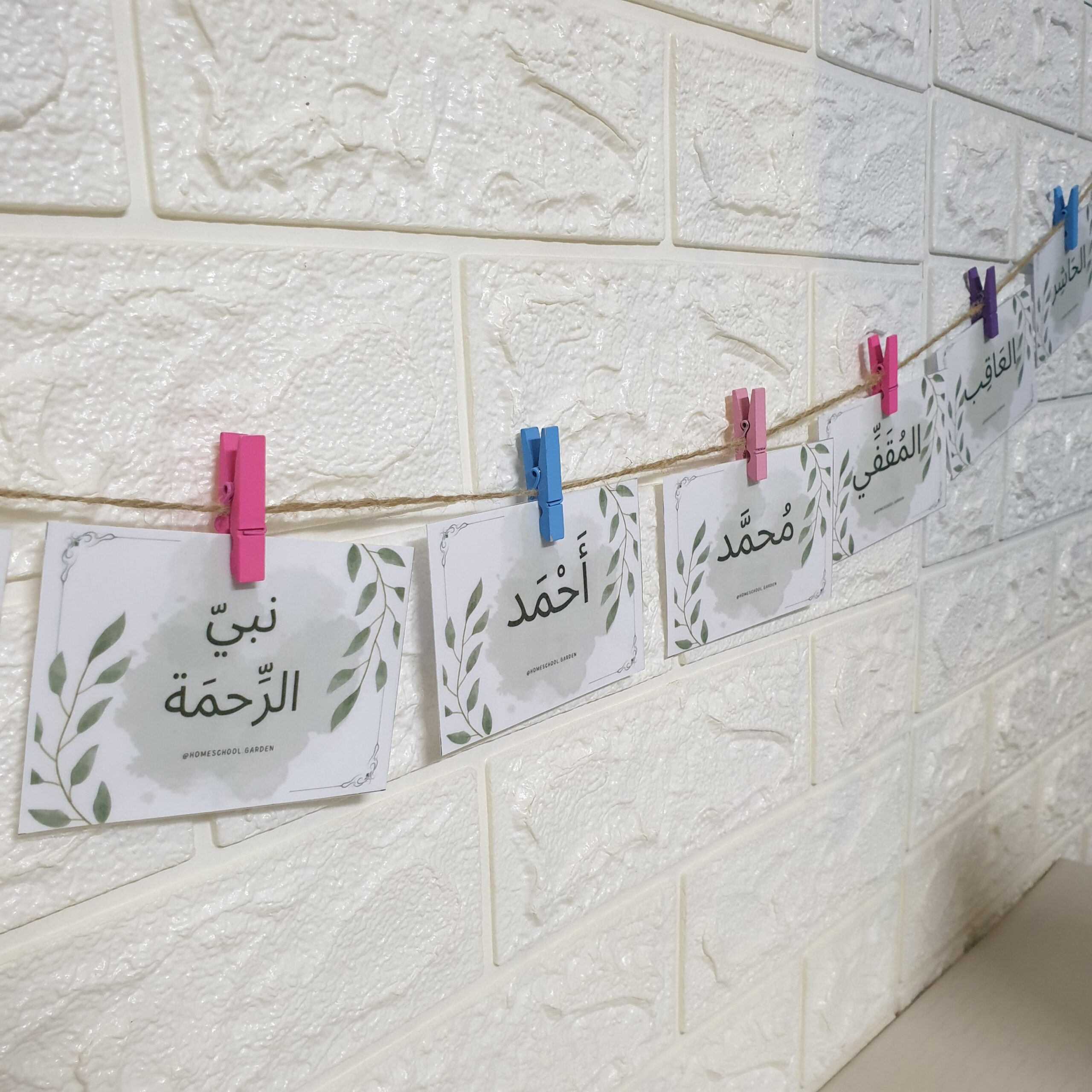 • بطاقات ملونة بها أسماء النبي صلى الله عليه وسلم، لتعليقها في الغرفة و تيسير حفظها