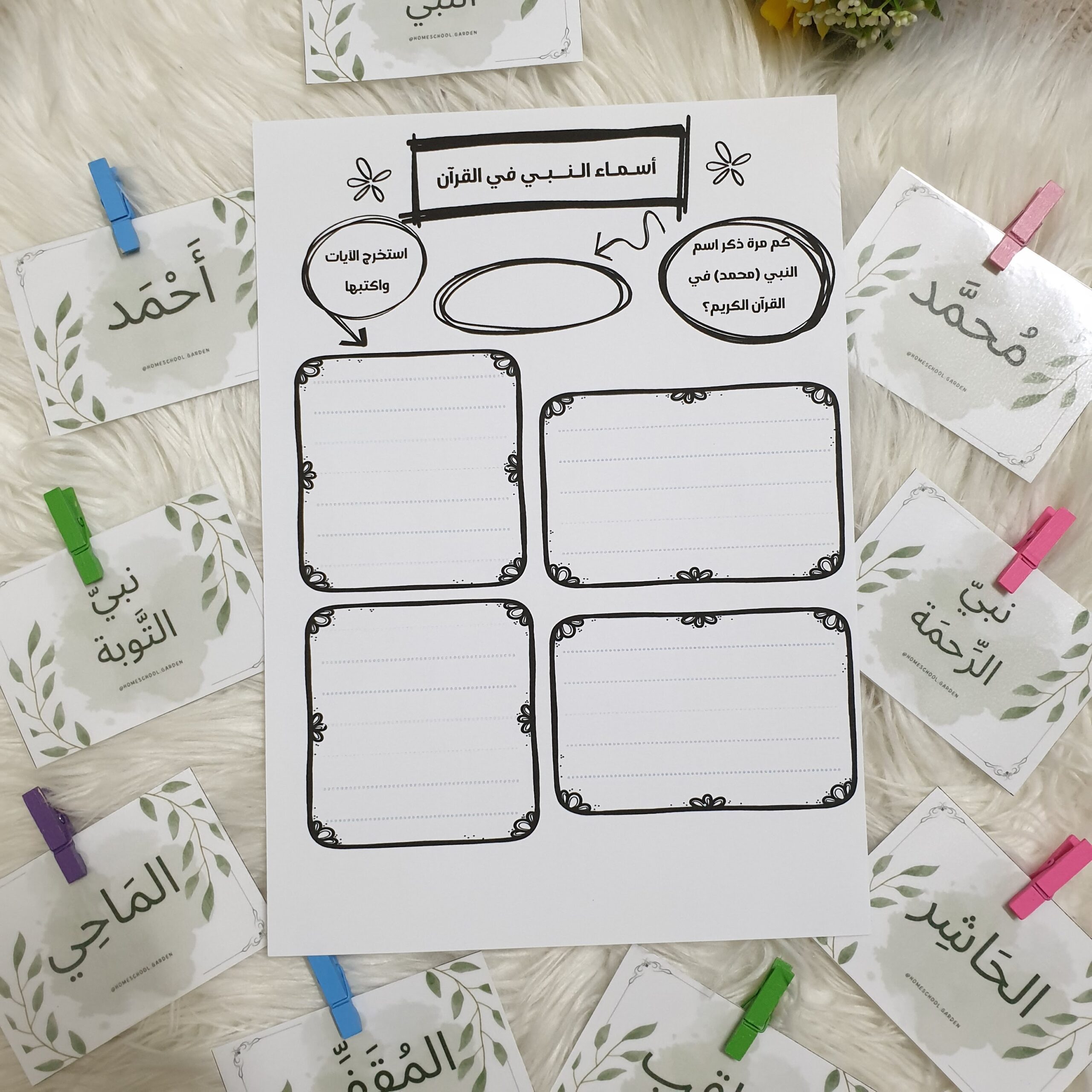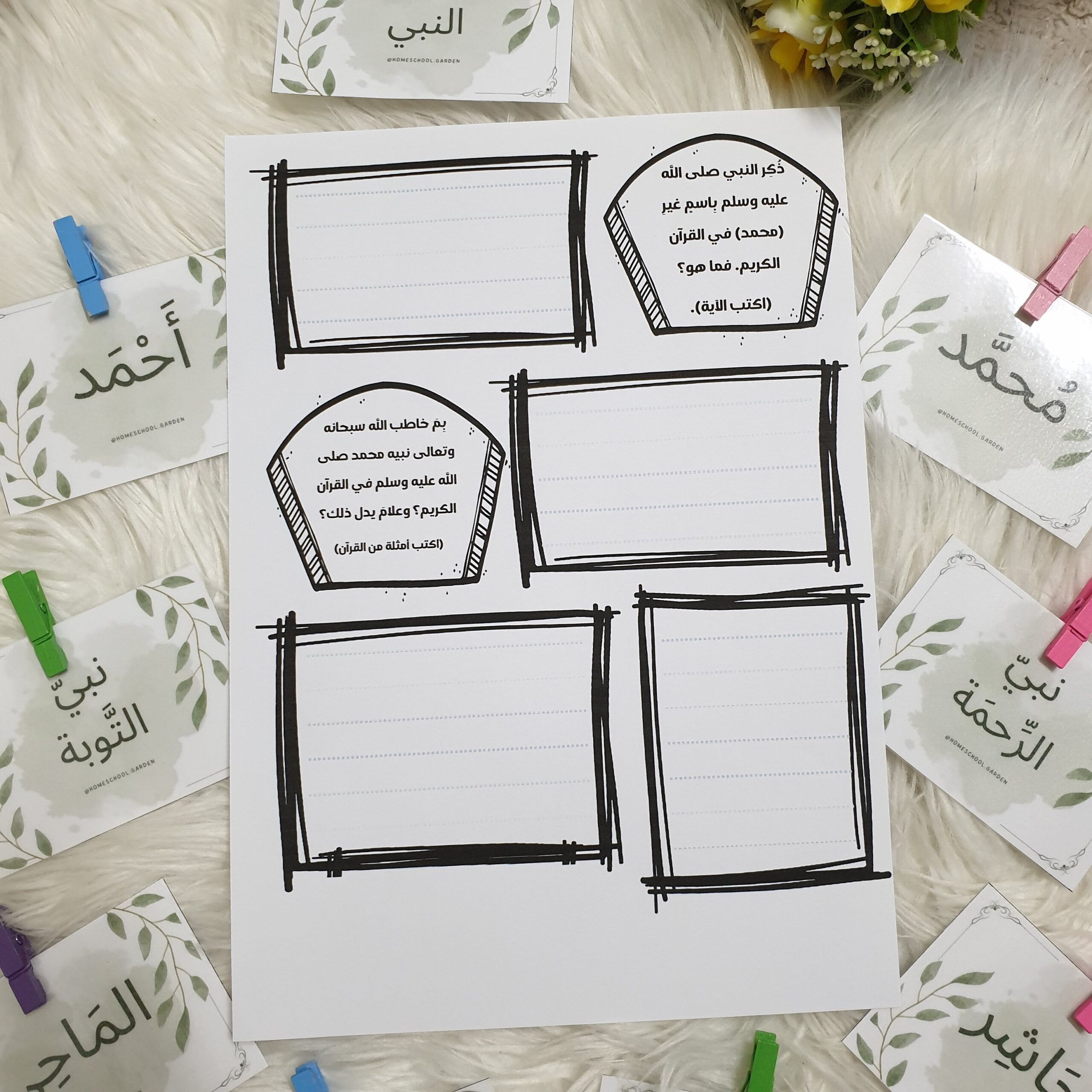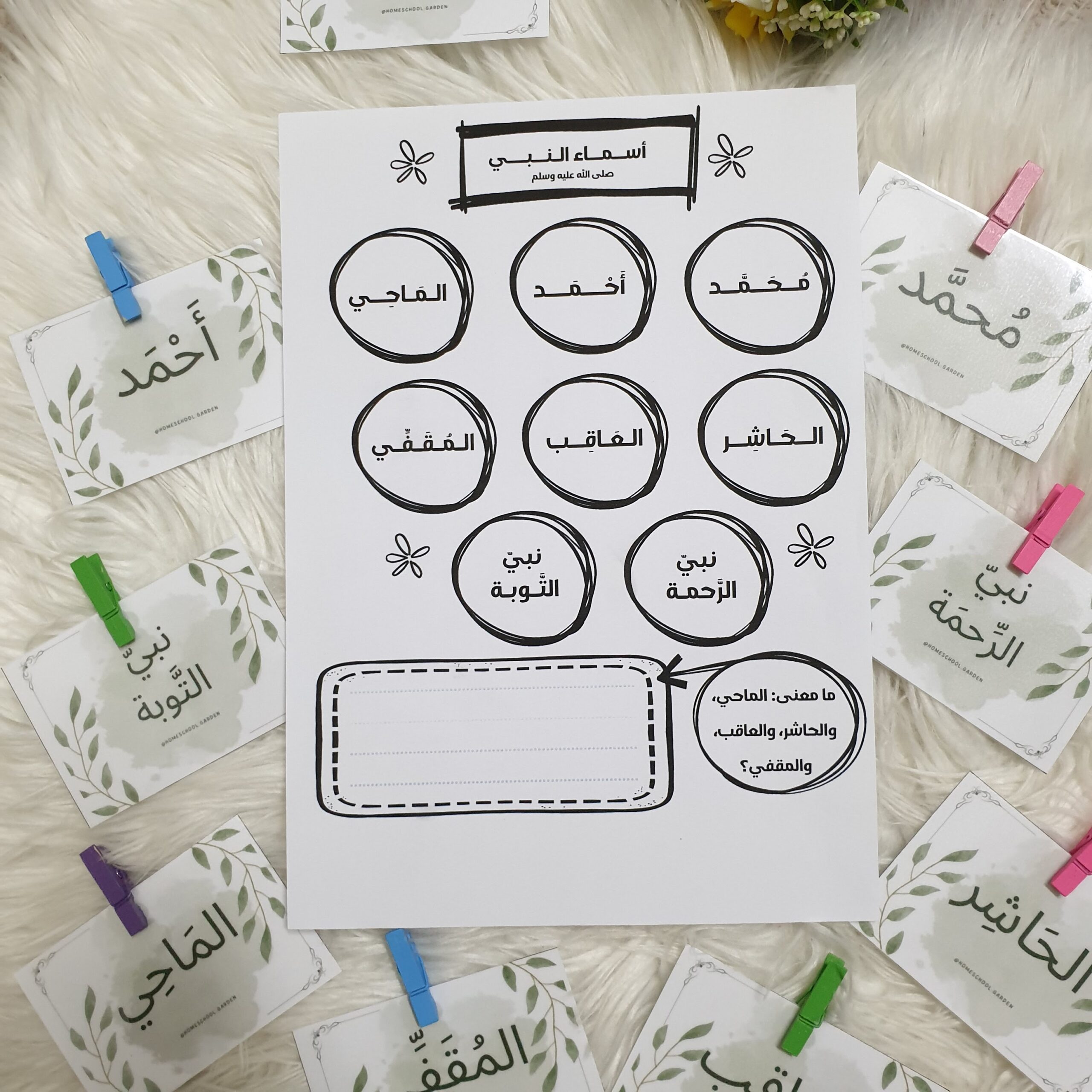 أوراق عمل مجانية و بطاقات تشتمل على أسماء النبي عليه الصلاة و السلام و بعضاً من صفاته الخَلقية (الشكلية) تعرض بطريقة تفاعلية تشجع البحث والتعلم