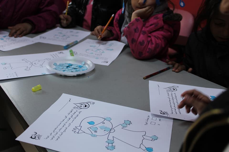 عملت غيمة من الكرتون ونزلت منها خيوطاً عليها اشكال كرتونية على شكل قطرات من الماء، يقوم الاطفال بأخذ القطرات و لصقها على اماكن الوضوء في جسم الطفل المرسوم على الورق، ثم لتثبيت الترتيب يُطلب منهم ترقيم القطرات حسب ترتيب أعضاء الوضوء