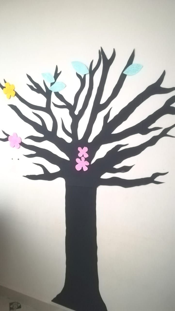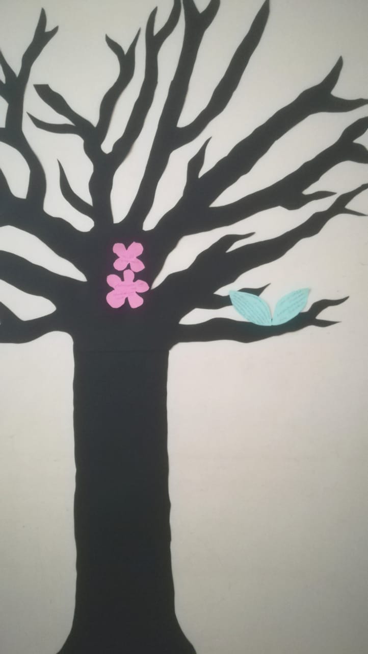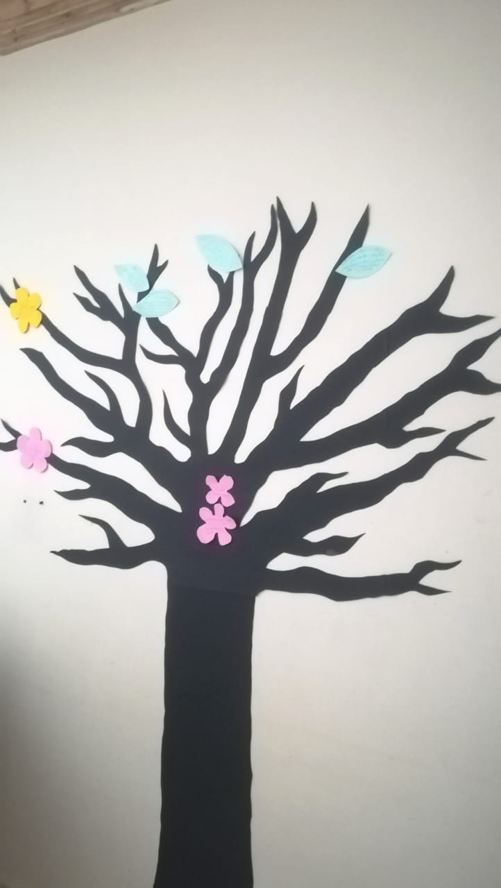 قمت برسم شجرة على أطباق من الكرتون الأسود وقصها ثم لصقها على الجدار … و طلبت من الأطفال قص أشكال من الأوراق و الورود