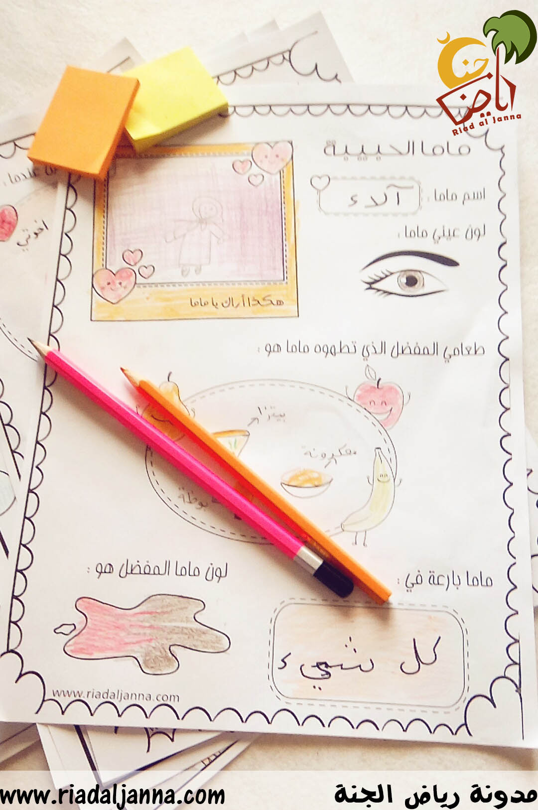• تتضمن الأوراق وصف الطفل لوالديه .. خارجياً وداخلياً … ماذا يحب أبي ؟ ماذا يحزن أمي ؟ ماهو اللون المفضل لهما ؟ وأسئلة أخرى ..