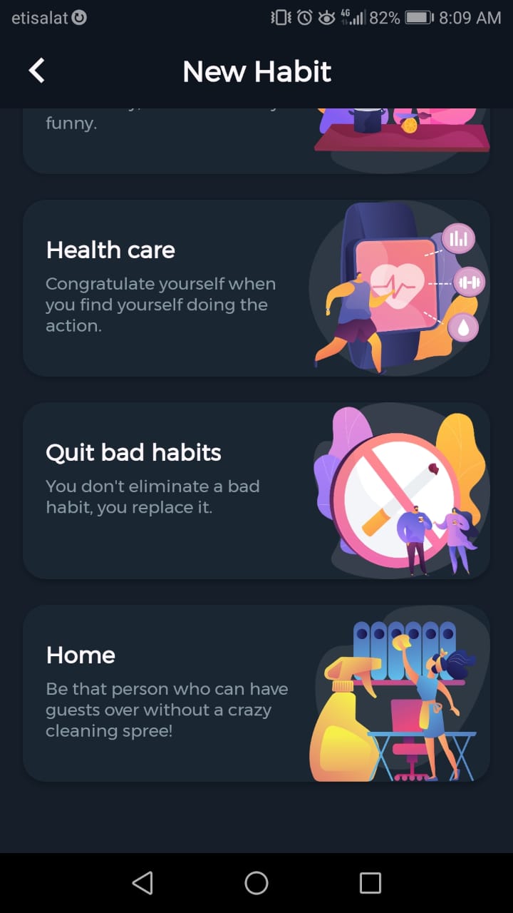 بالضغط على زر + تقوم بإضافة عادة جديدة .. يمكنك إنشاء واحدة  … أو الاختيار من الكثيير من الخيارات المنشأة مسبقاً من قبل التطبيق ..
