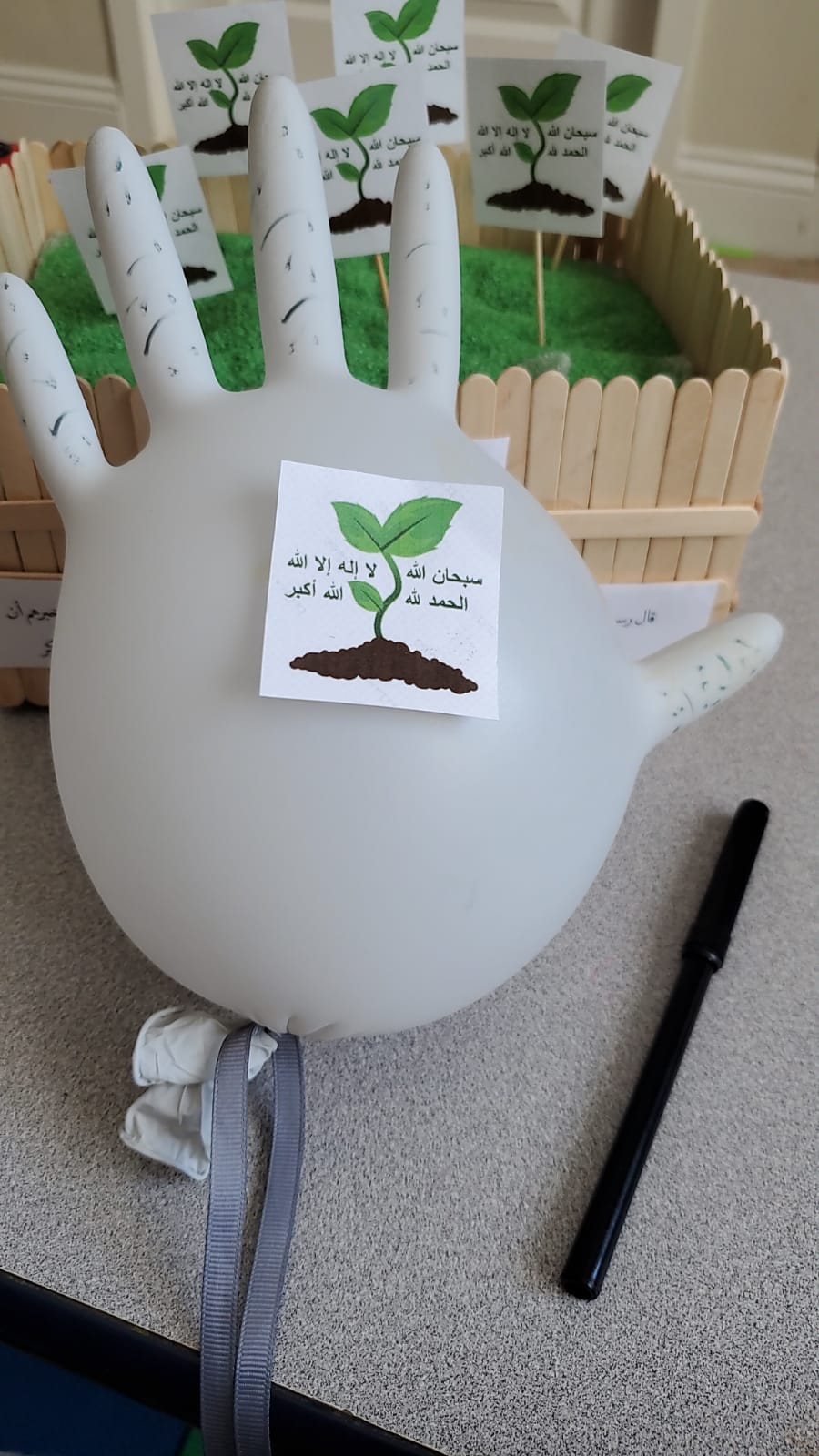 نحضر قفازاً طبياً و ننفخه … ثم نرسم ثلاث خطوط على كل أصبع لتصبح مثل عقل الأصابع … و يقوم الطفل بوضع نقطة بالقلم كلما قال تسبيحة ..