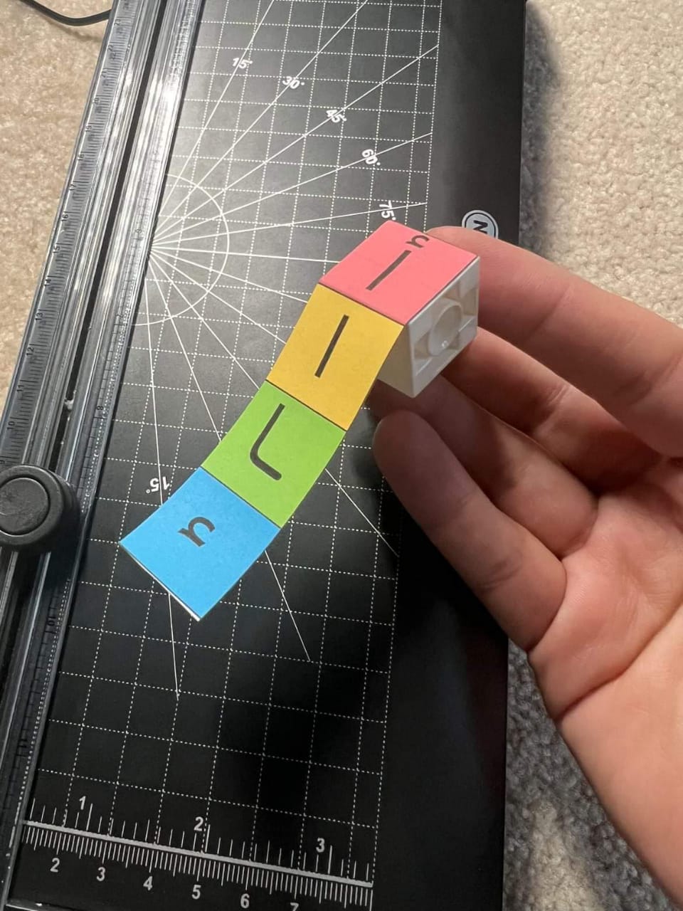 – نقوم بقص كل حرف طوليا و الصاقه على المكعب بحث يكون كل وجه له حالة من حالات الاحرف بالكلمة