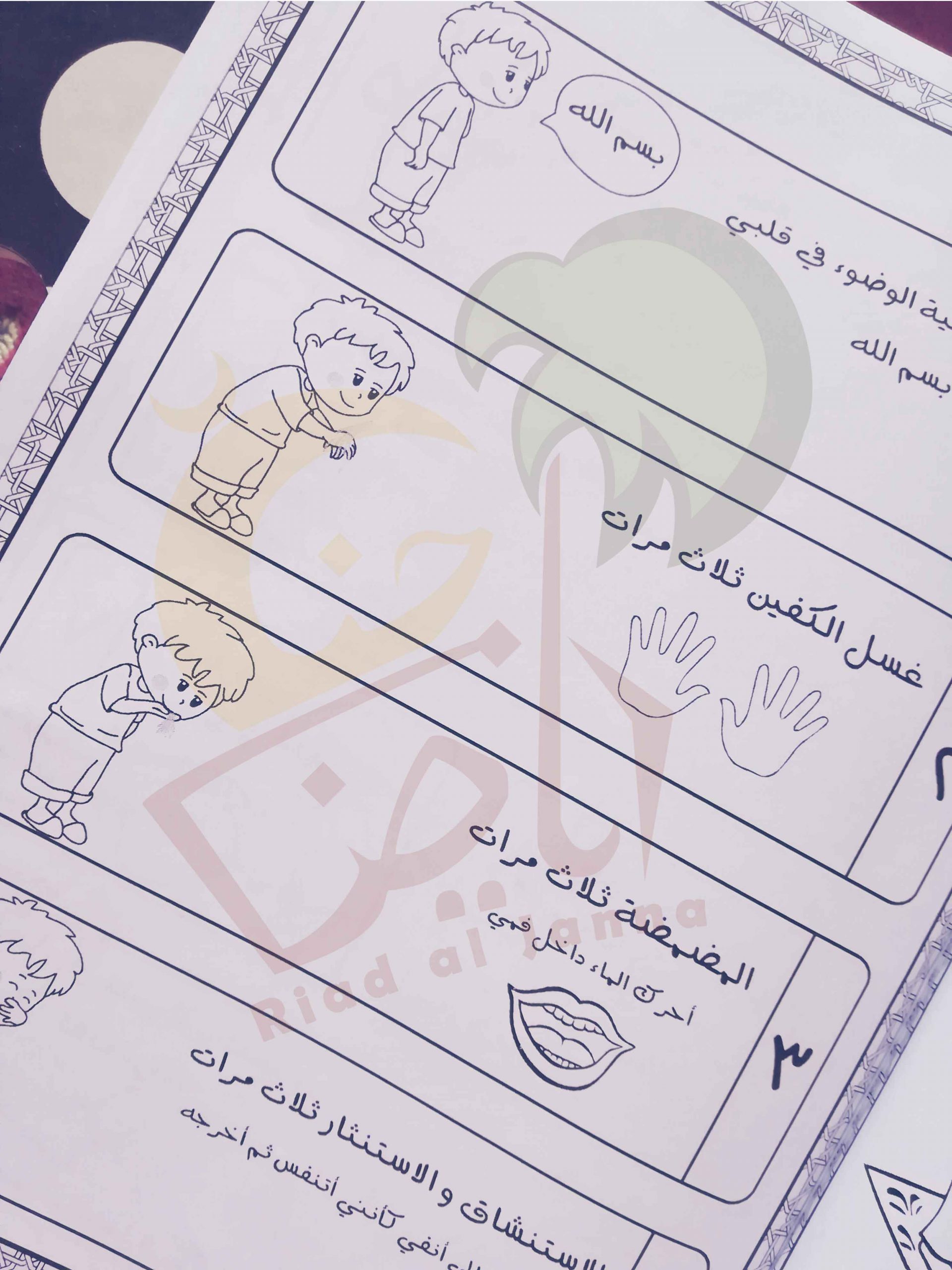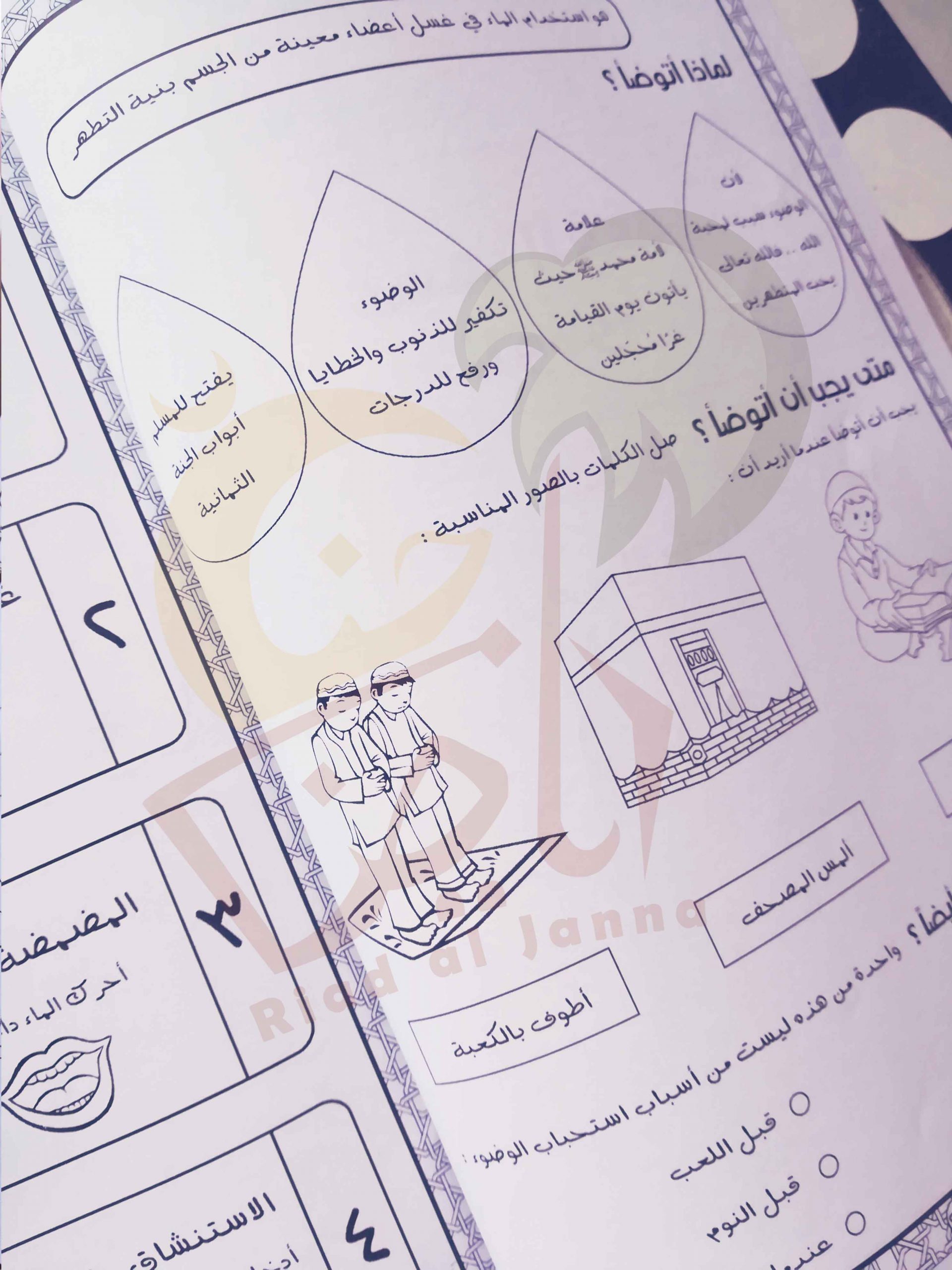 كتيب ممتع لتعليم طريقة الوضوء للأطفال برسوم جميلة و خطوات واضحة و تمارين شيقة مدعم بفيديوهات للايضاح و أفكار للتطبيق العملي و النشاط في المسجد أو المنزل