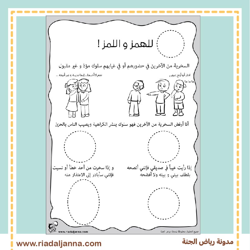النشاط الأول يقوم فيه الطفل بتصميم منشور توعوي بسيط يناسب سنه .. عن الهمز و اللمز و ضررهما … يكفي طباعة الأوراق و استخدامها بالقص و اللصق و التلوين ..