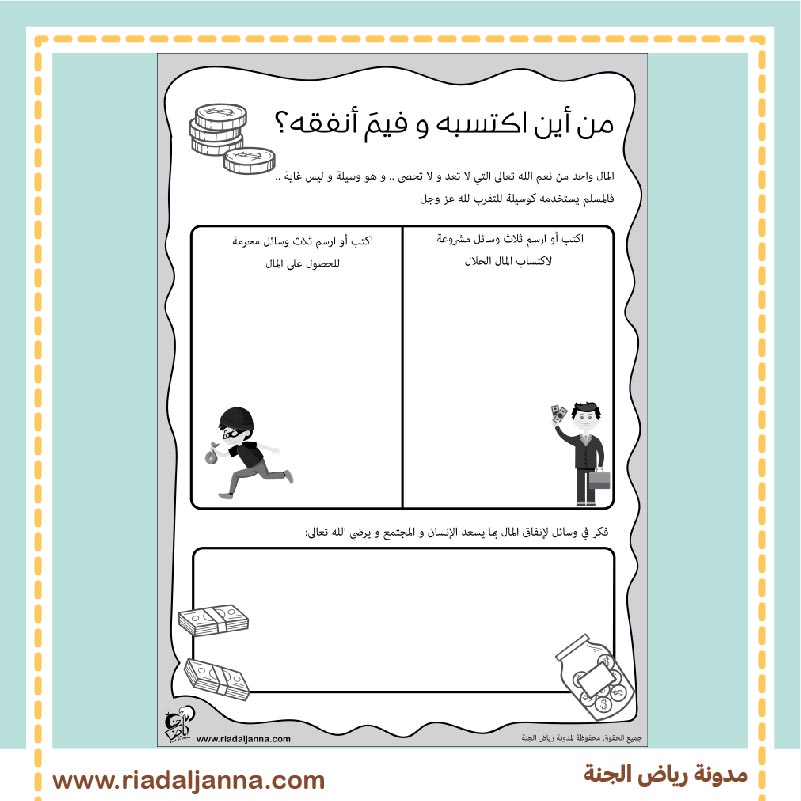 النشاط الثاني نلفت فيه انتباه الطفل إلى أن المال هو وسيلة وليس هدفاً بجد ذاته … وأن الله تعالى سيسألنا و يحاسبنا من أين حصلنا على المال و أين صرفناه …