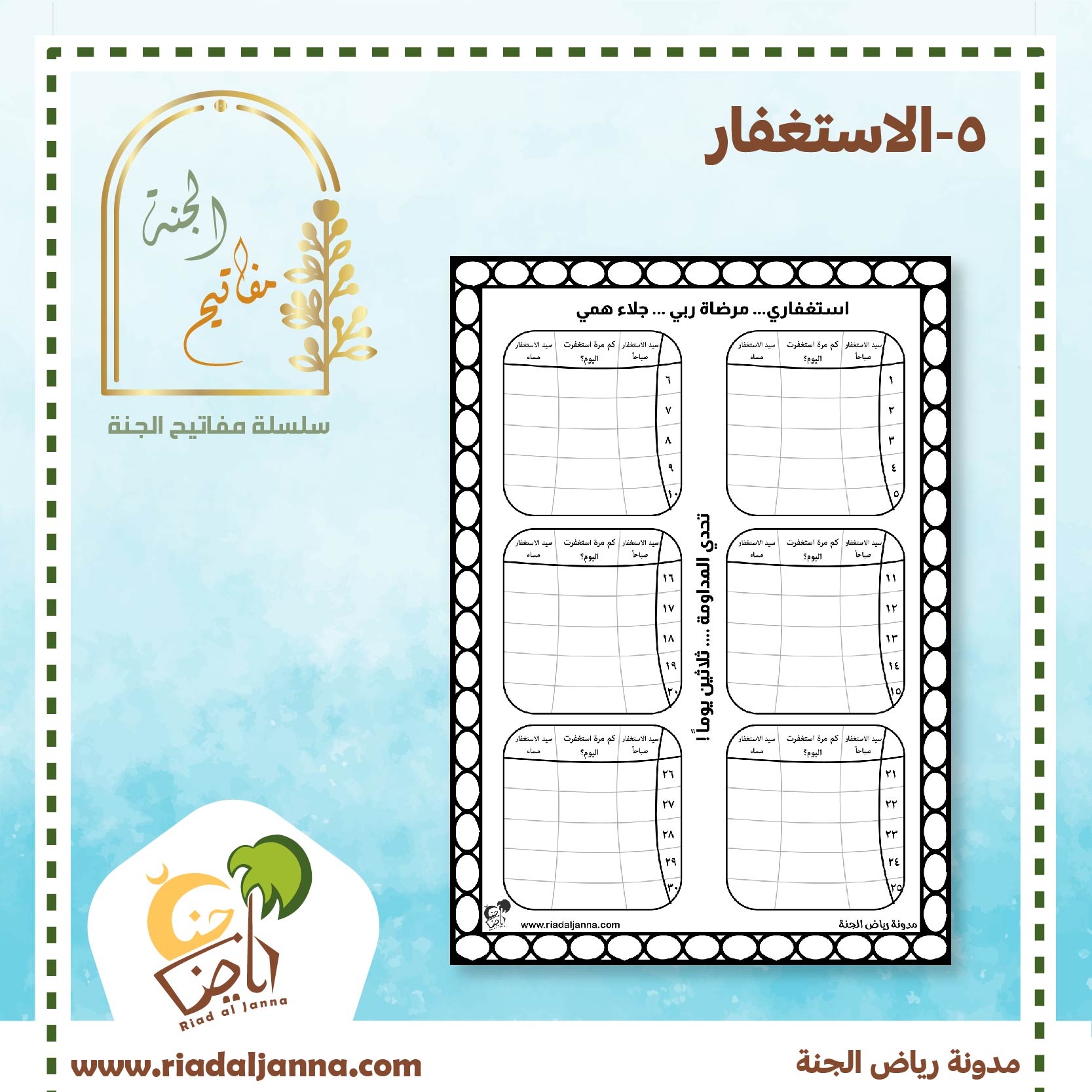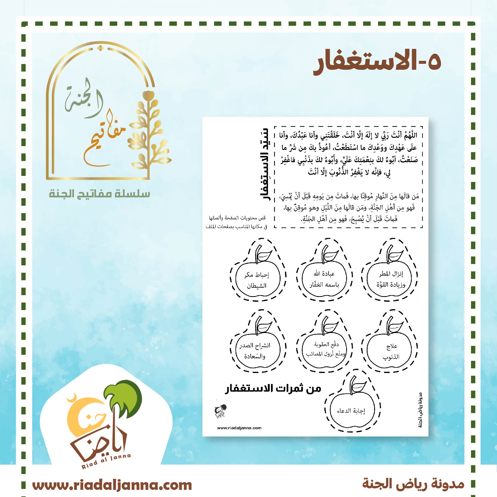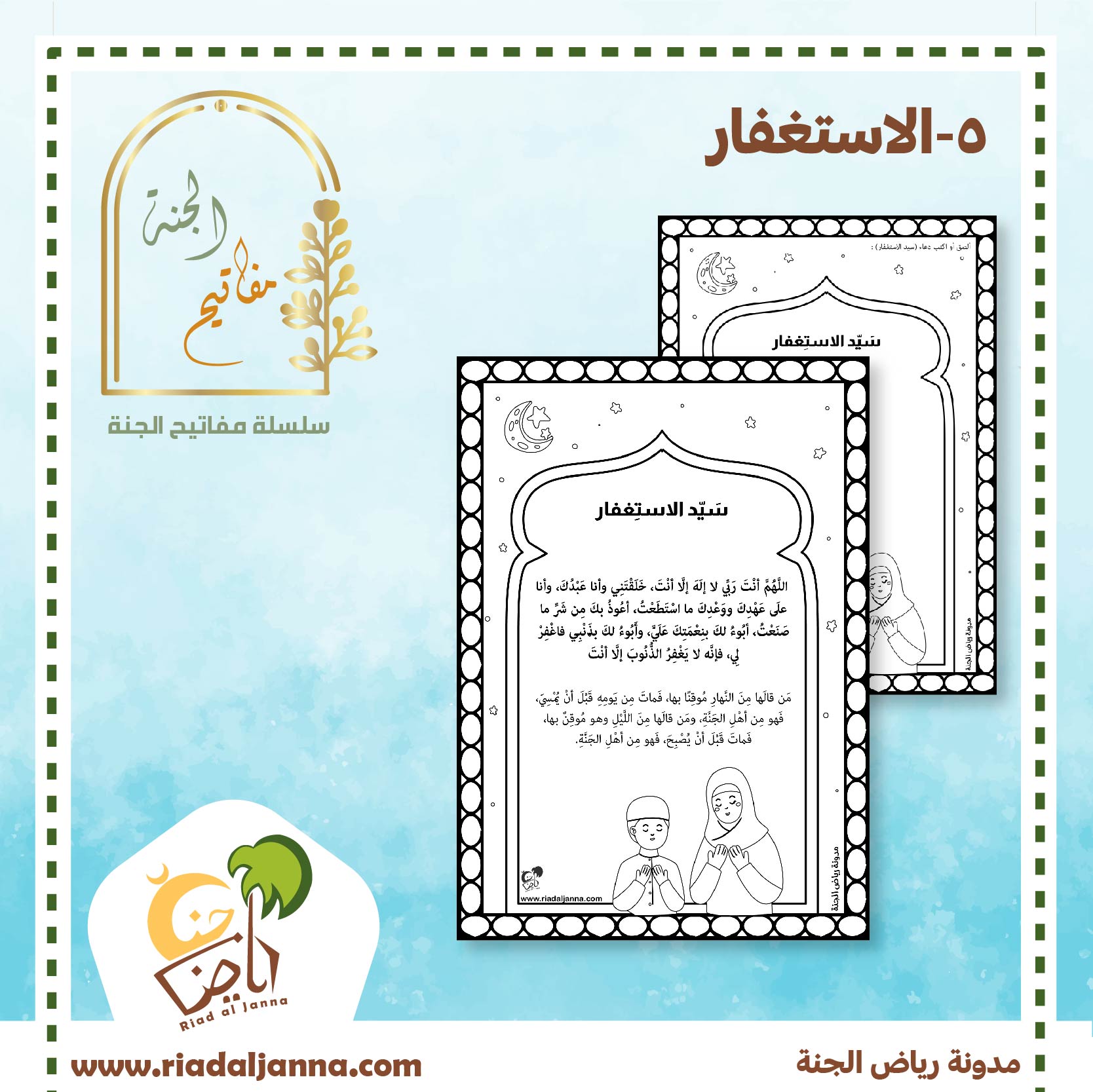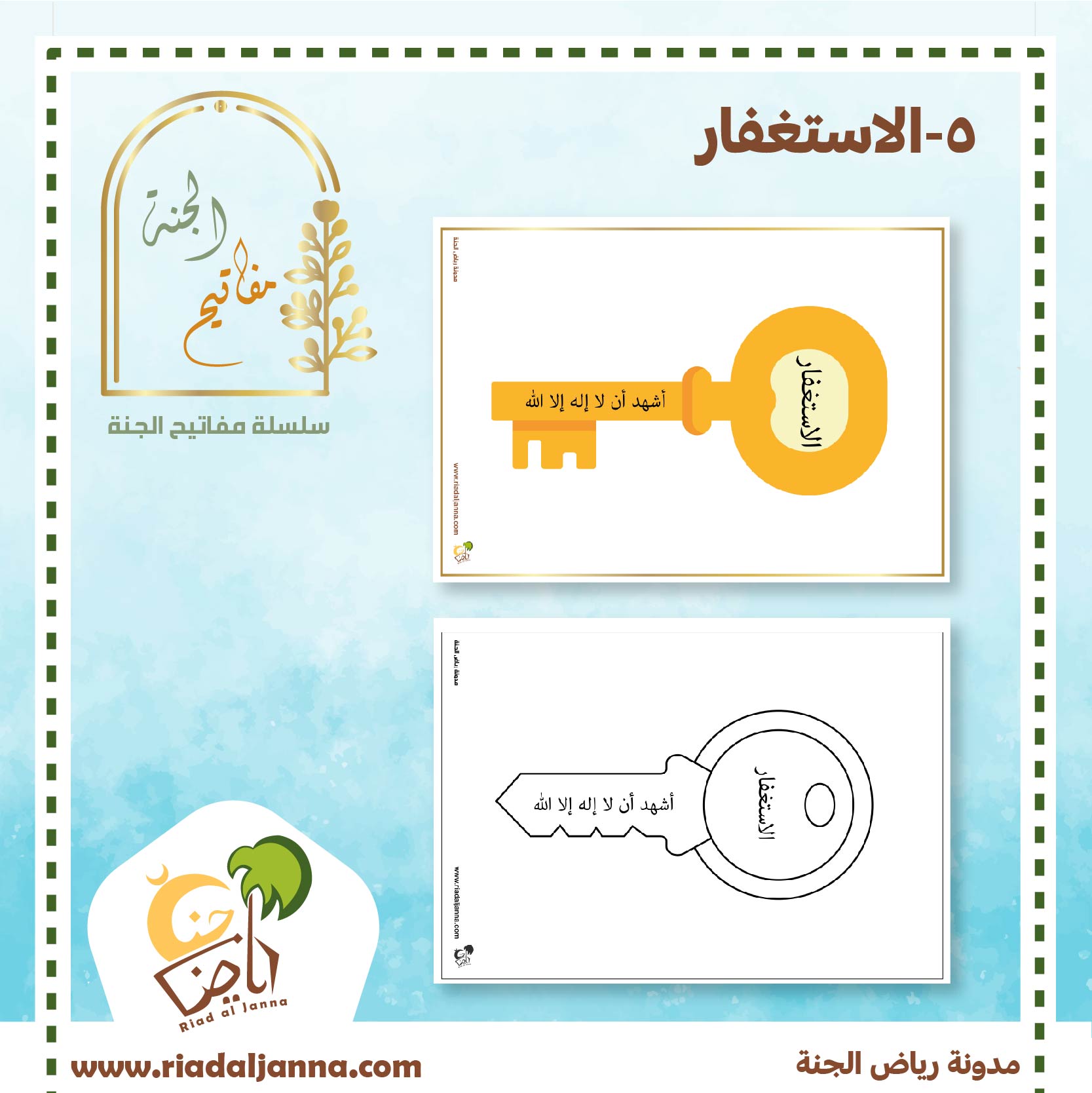 سلسلة التشويق للجنة .. و إرشاد الطفل لأعمال يرتجى بها طلب الجنة .. و الحث على تطبيق هذه الأعمال .. في سياق لطيف ممتع مع أوراق عمل وبرامج للتشجيع.. موضوع اليوم :المفتاح الثالث الاستغفار