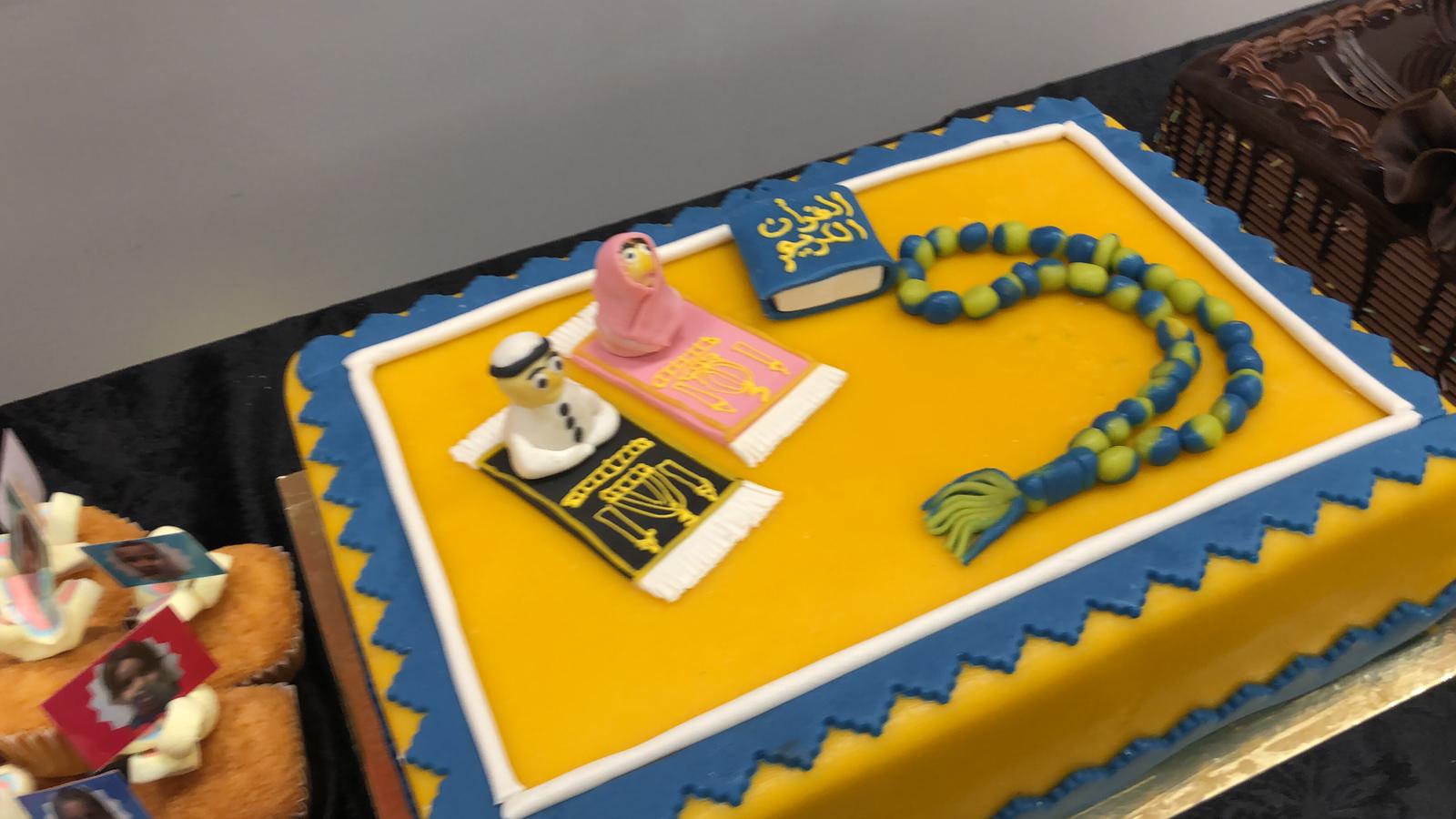 فكانت الهدية عبارة عن سجادة صلاة مخيط عليها اسمه، مع تاج أمير الصلاة وعليه صورته، وأوراق متابعة الصلاة من مطبوعات المدونة… ورود وكيكة وحلوى للحلوين الذين تعلموا الصلاة