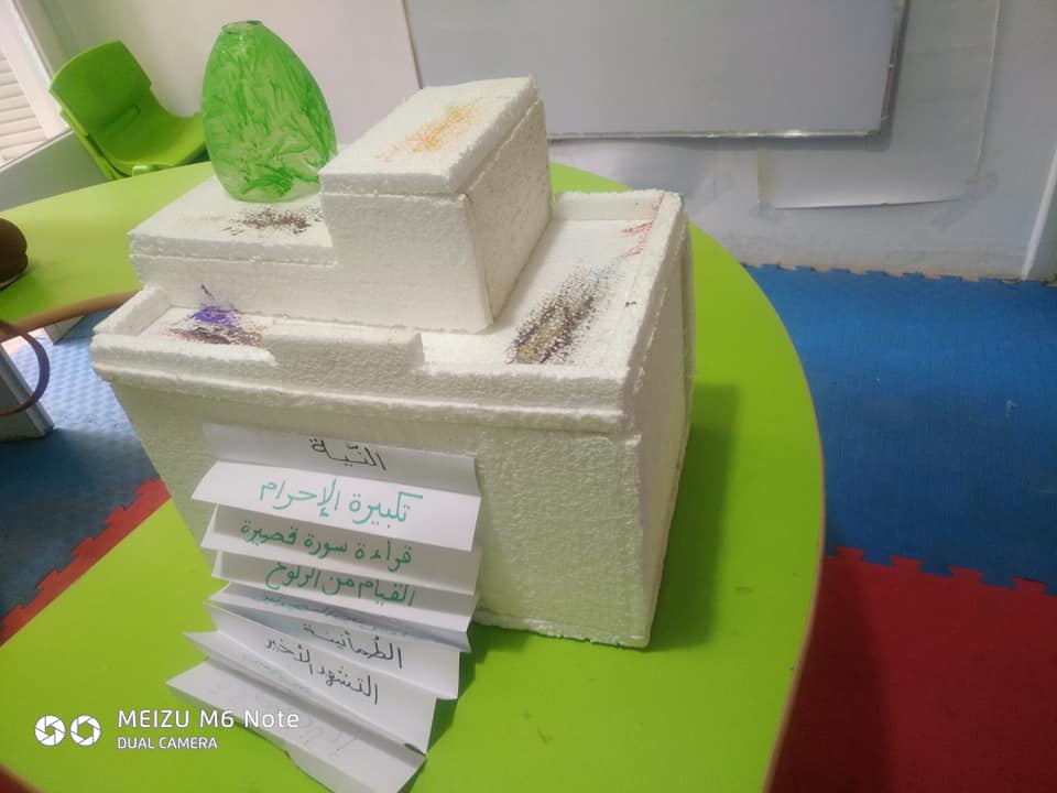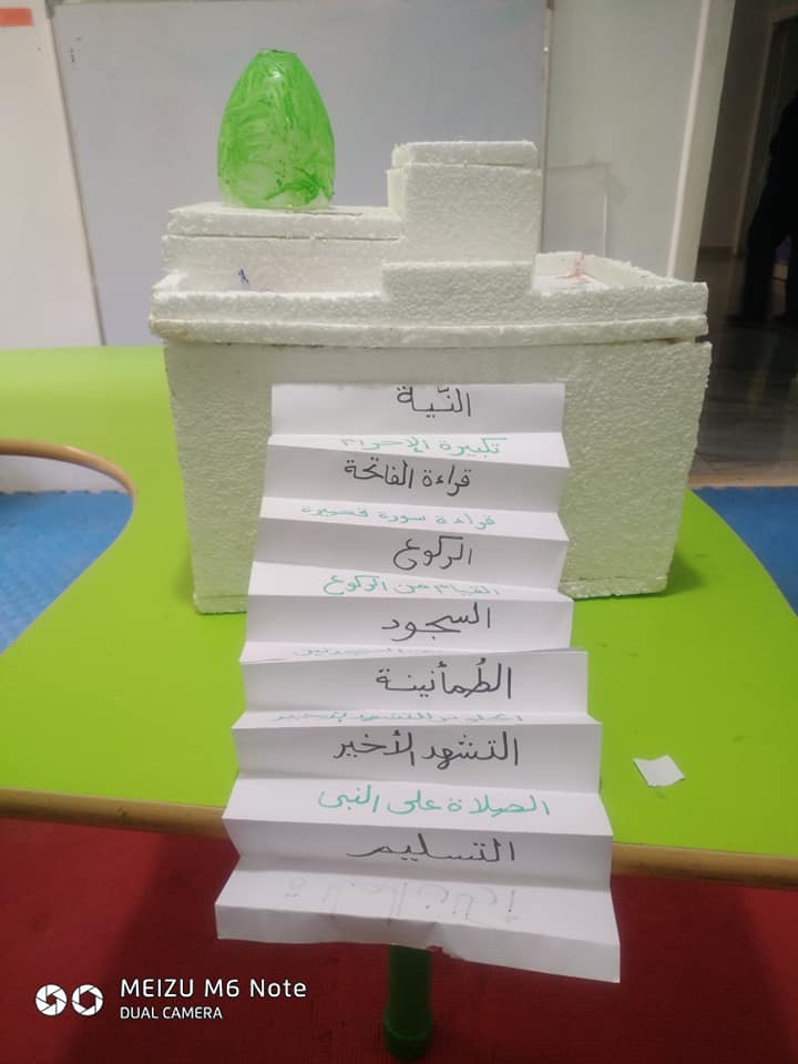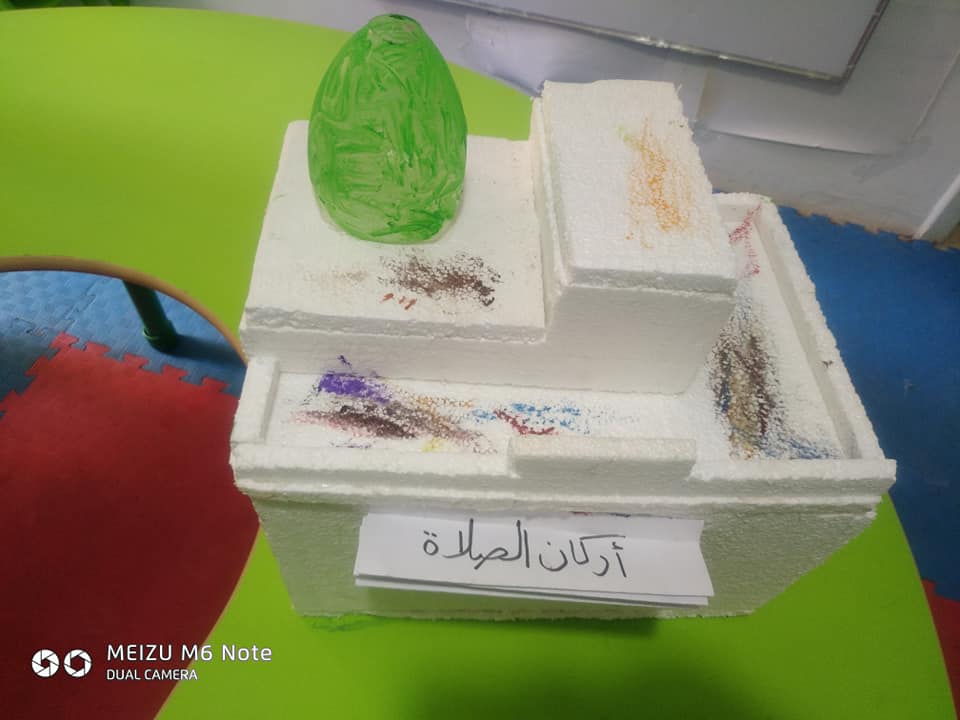 –  صنعت مجسم مسجد وقاموا بتلوين قبته (المسجد ينقصه الأبواب بأوراق الكانسون لم يسعفني الوقت لصنعها)