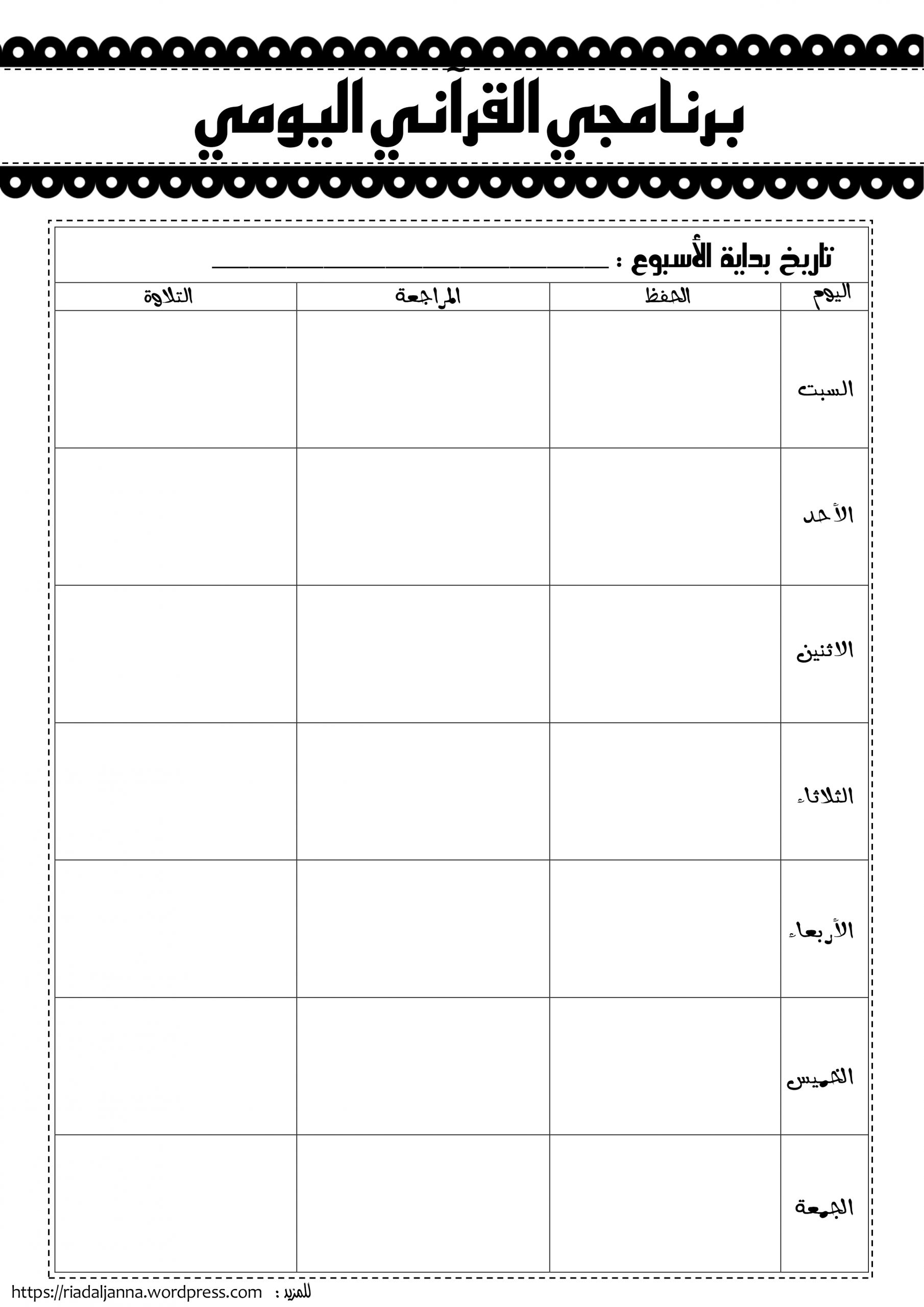 - جداول لتسجيل الحفظ والتلاوة والمراجعة لكتاب الله